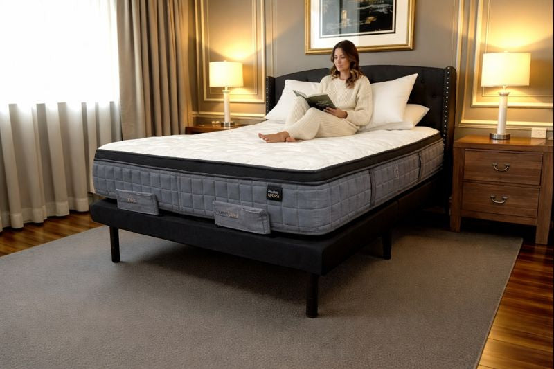Industry-leading Okin Motors elevate the head and foot for your utmost comfort.
