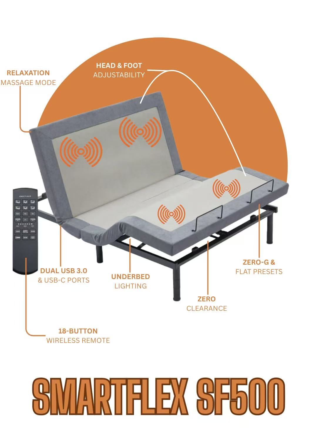 Discover why the SF500 Adjustable Bed is our best-selling model. It’s loaded with premium comfort features, including a backlit remote with flashlight, soothing head and foot massage with three intensities and multiple patterns, gentle under-bed lighting, and convenient USB/USB-C charging ports. Enjoy instant comfort with preset lay-flat, anti-snore, and zero-gravity positions. Supported by six adjustable legs and a heavy-duty 1000-lb all-metal frame, the SF500 brings luxury and reliability together in one perfect sleep system.
